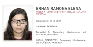 O tânără de 24 de ani din județul Suceava este căutată de Poliție, după ce a plecat de acasă și nu s-a mai întors. Este vorba de Ramona Elena Erhan, din Câmpulung Moldovenesc.